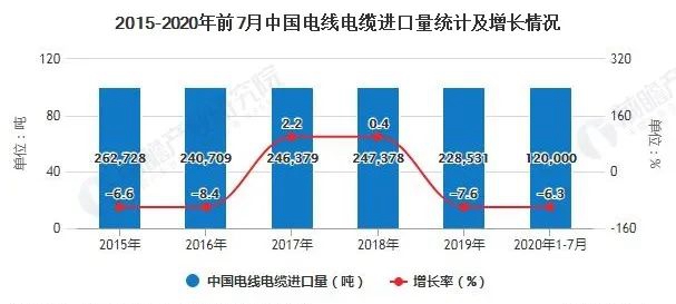 2015-2019年5年間我國電線電纜進口量從26萬噸降至23萬噸,截止至2020年1-7月進口量為12噸,同比下降6.3%,隨著行業(yè)進口量的進一步下降,電線電纜將迎來新的發(fā)展。