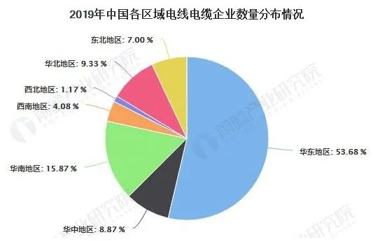 從圖中可以看出,我國全國各區(qū)域電線電纜企業(yè)分布不均,從各個地區(qū)的企業(yè)數量來看,2019年,華東地區(qū)電線電纜行業(yè)企業(yè)數量多,占全行業(yè)企業(yè)總數的一半以上,達到53.68%,具有較強的競爭優(yōu)勢;其次是華南地區(qū),企業(yè)數量占行業(yè)內企業(yè)總數的15.87%,其他地區(qū)企業(yè)數量占比均在10%以下。